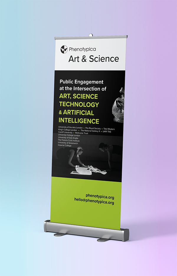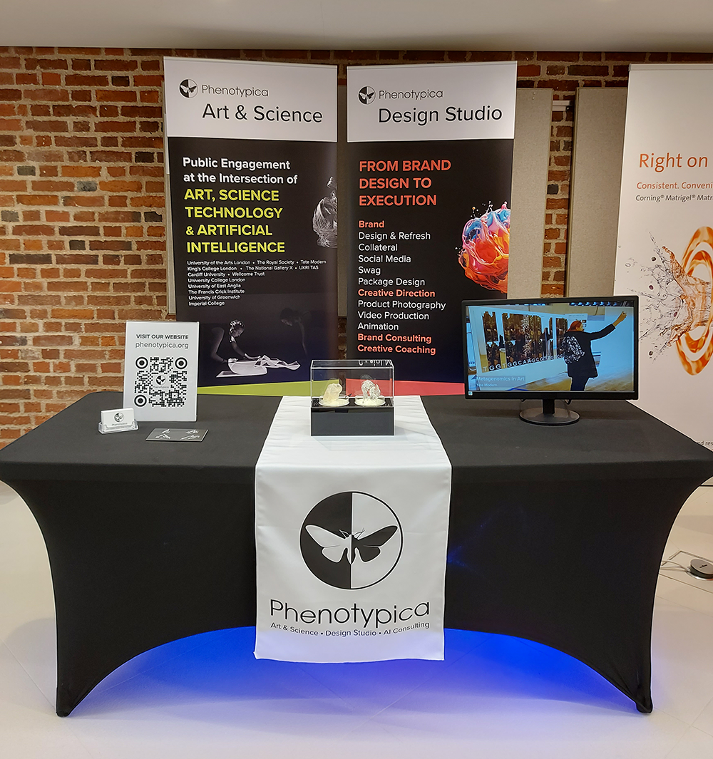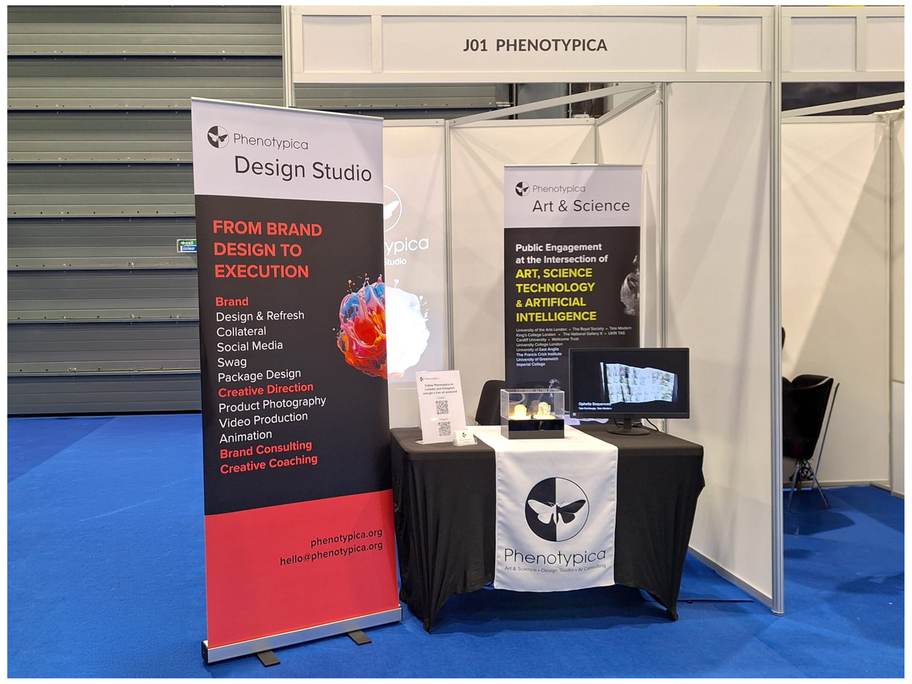 With the studio's work spanning two distinct areas: design consulting and public engagement at the intersection of art, science and technology, the booth was designed to represent both sides of the business through two roller banners, three exhibited artworks and showreel.